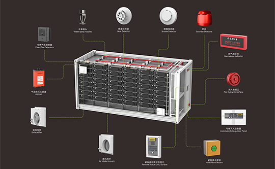 本項目位于新疆克拉瑪依市白堿灘區。儲能集裝箱結構尺寸為:長12129mm×寬2438mm×高3350mm。儲能消防系統采用儲能電站用火災報警控制裝置。電池倉內設置復合探測器,電氣倉內設置感溫探測器和感煙探測器、警鈴;在防護區出口外上方設置放氣指示燈、聲光報警器;在防護區出口外設置緊急啟停按鈕。在防護區內設置柜式七氟丙烷氣體滅火裝置,包括滅火劑儲存容器、容器閥、滅火藥劑、電磁鐵啟動裝置、噴嘴、壓力顯示器、壓力信號反饋裝置等組成。可以實現儲能集裝箱內部的消防預警和滅火保護。